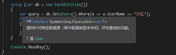 可以看到query是个IQueryable<User>,也就是说,DbSet<T>的Where()方法,默认是来自Queryable下的扩展方法