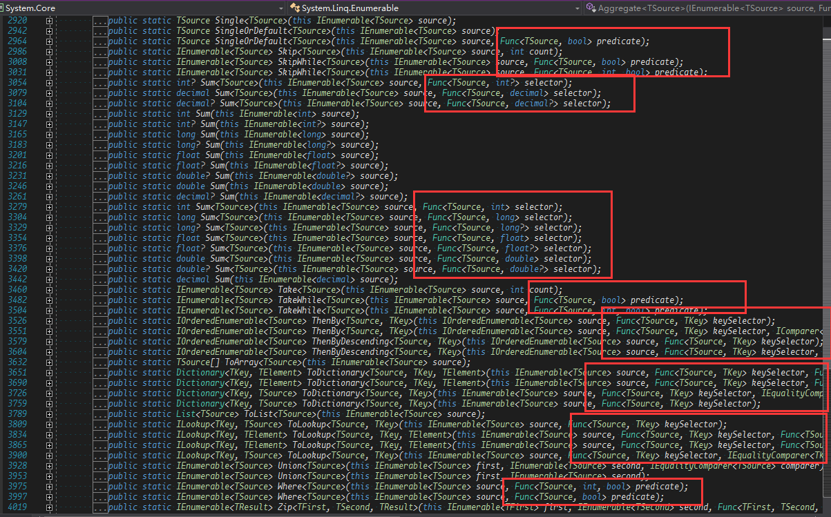 其实我们反编译仔细观察IQueryable的话,实际上也继承了IEnumerable,所以这两个接口的方法,在很大程度上是一样的,那么,微软为什么要设计出两套扩展方法呢?