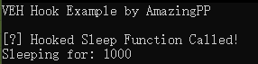 1 2 3 4 5 6 7 8 9 10 11 12 13 14 15 16 17 void WINAPI my_sleep (DWORD ms) { std ::cout << "[?] Hooked Sleep Function Called!" << std ::endl ; std ::cout << "Sleeping for: " << ms << std ::endl ; } int main () { std ::cout << "VEH Hook Example by AmazingPP\n" << std ::endl ; auto hooking = make_veh_hook(Sleep, my_sleep); hooking.enable(); Sleep(1000 ); hooking.disable(); Sleep(1000 ); return 0 ; }